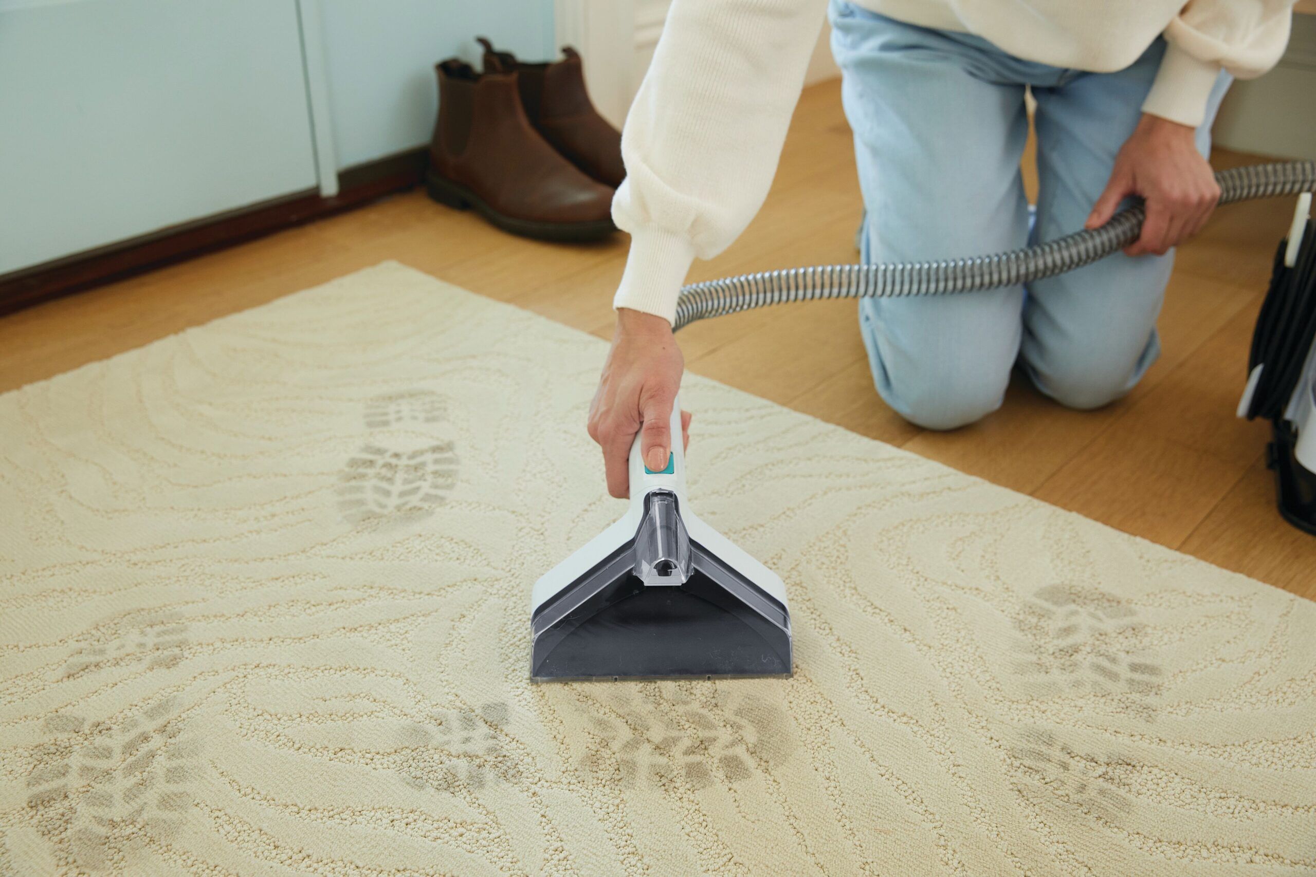 This lightweight spot washer is easy to carry around your home with a comfortable handle and long power cord. Clean anywhere with the flexible hose and 4 cleaning attachments: Pet Stain Trapping Tool, Large Tough Stain Tool, Tough Stain Tool and Integrated Crevice Tool.