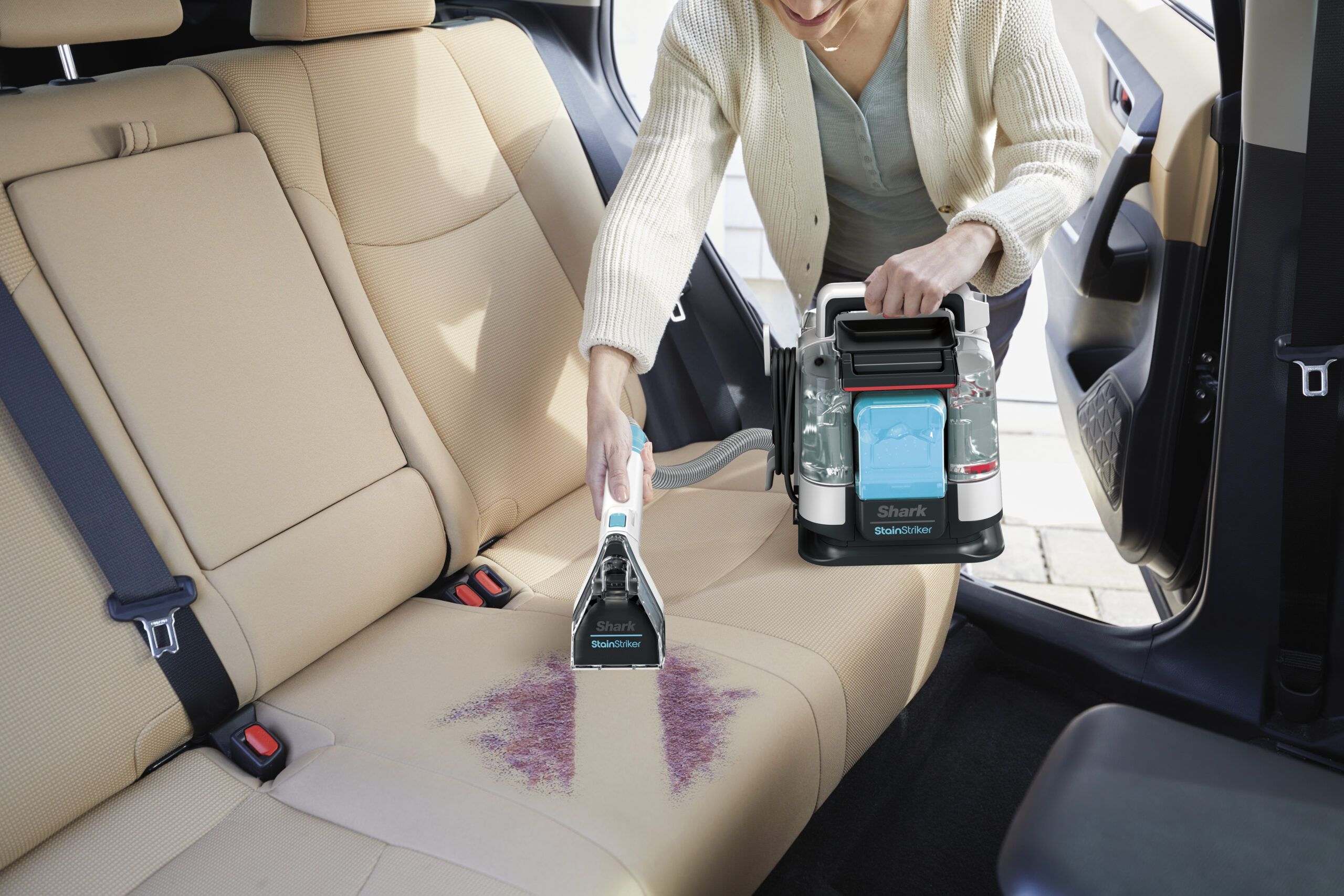 StainStriker’s dual-activated cleaning solution combines 2 Shark formulas inside the handheld stain cleaner – CarpetXpert Deep Clean Pro and StainStriker OXY Multiplier. These bespoke chemicals work together to remove ground-in dirt, stubborn stains and odours. No pre-treat required.